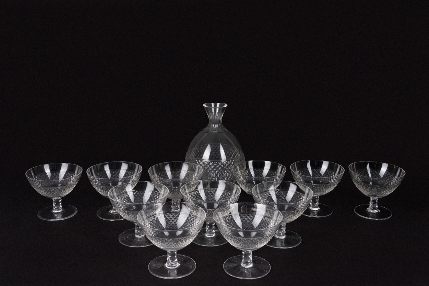 Servizio composto da undici coppe da champagne e una bottiglia in vetro inciso a motivi geometrici