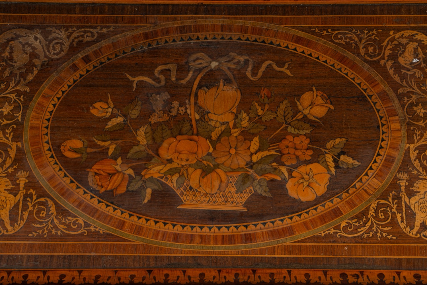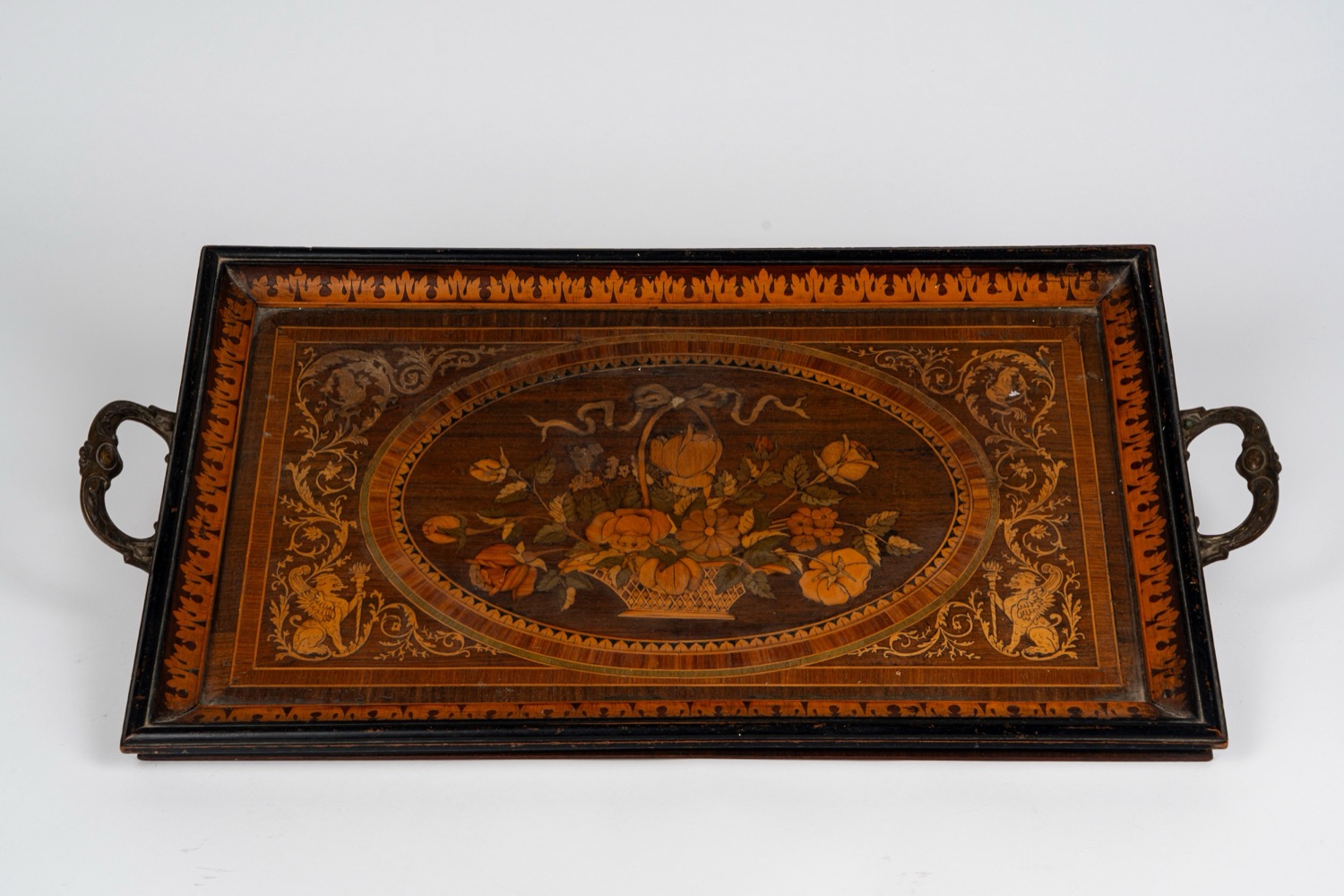 piano decorato a intarsio policromo raffigurante composizione floreale entro riserva ovale, incorniciata da motivi ornametali di gusto classico, manici laterali sagomati in metallo.piano decorato a intarsio policromo raffigurante composizione floreale entro riserva ovale, incorniciata da motivi ornametali di gusto classico, manici laterali sagomati in metallo.