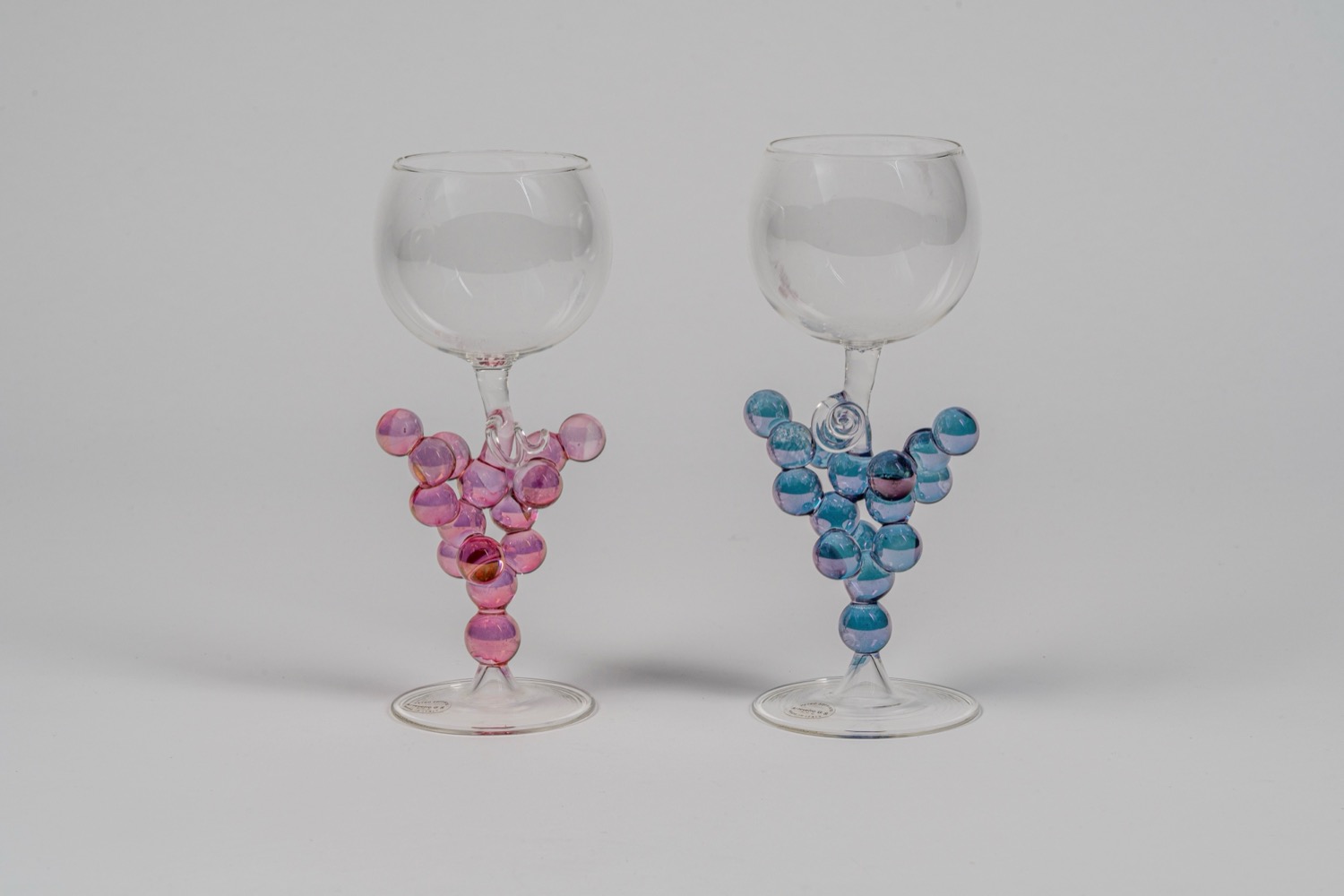 Coppia di calici in vetro soffiato trasparente e policromo, XX secolo