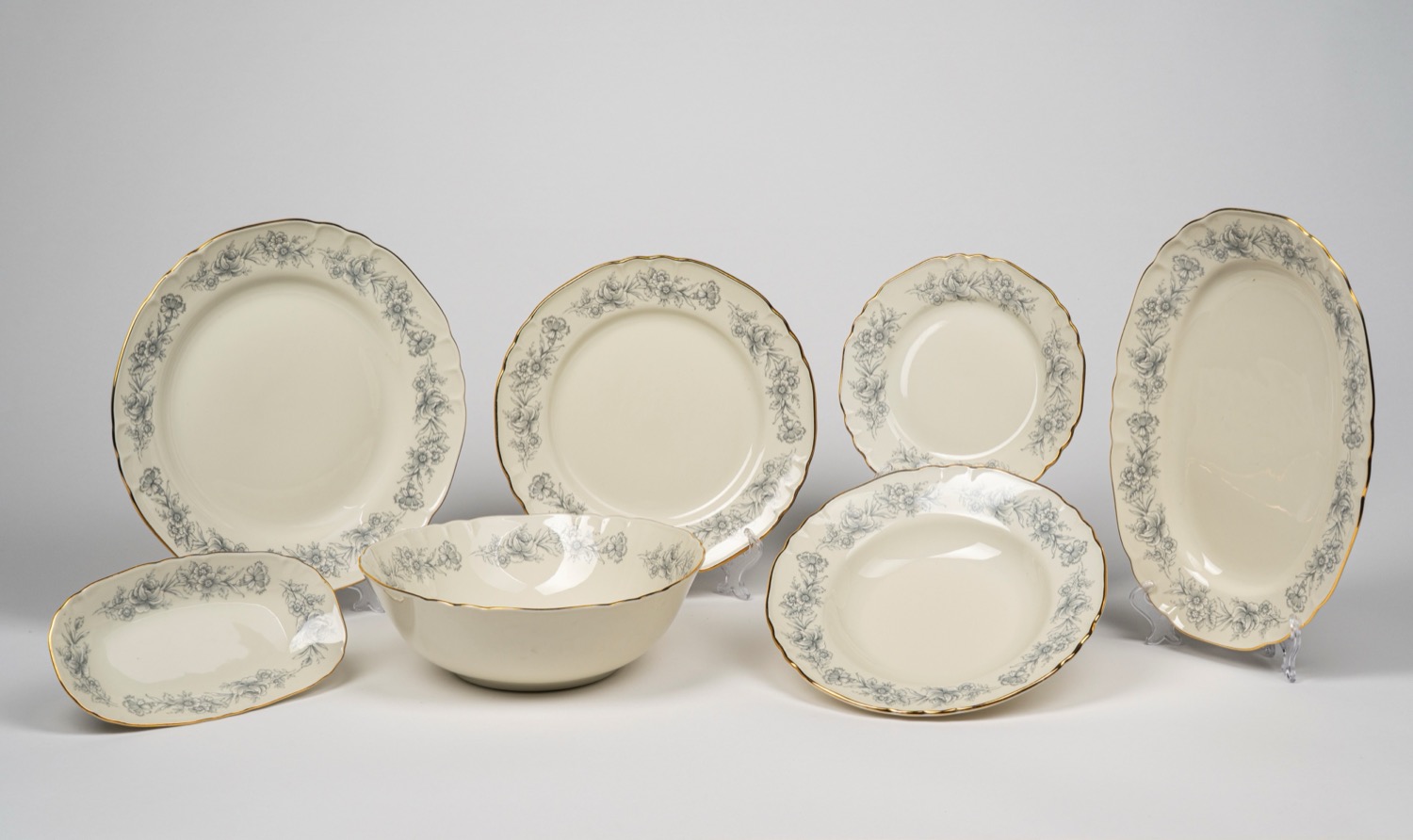 Composto da 12 piatti piani, 12 piatti fondi, 12 piattini da dolce, 1 insalatiera, un piatto tondo da portata, un vassoio e un vassoietto ovaleComposto da 12 piatti piani, 12 piatti fondi, 12 piattini da dolce, 1 insalatiera, un piatto tondo da portata, un vassoio e un vassoietto ovale