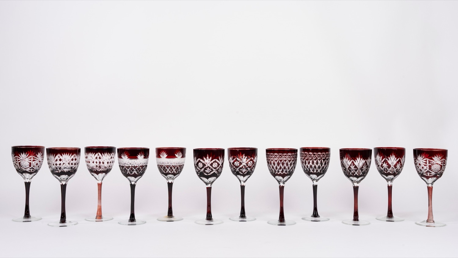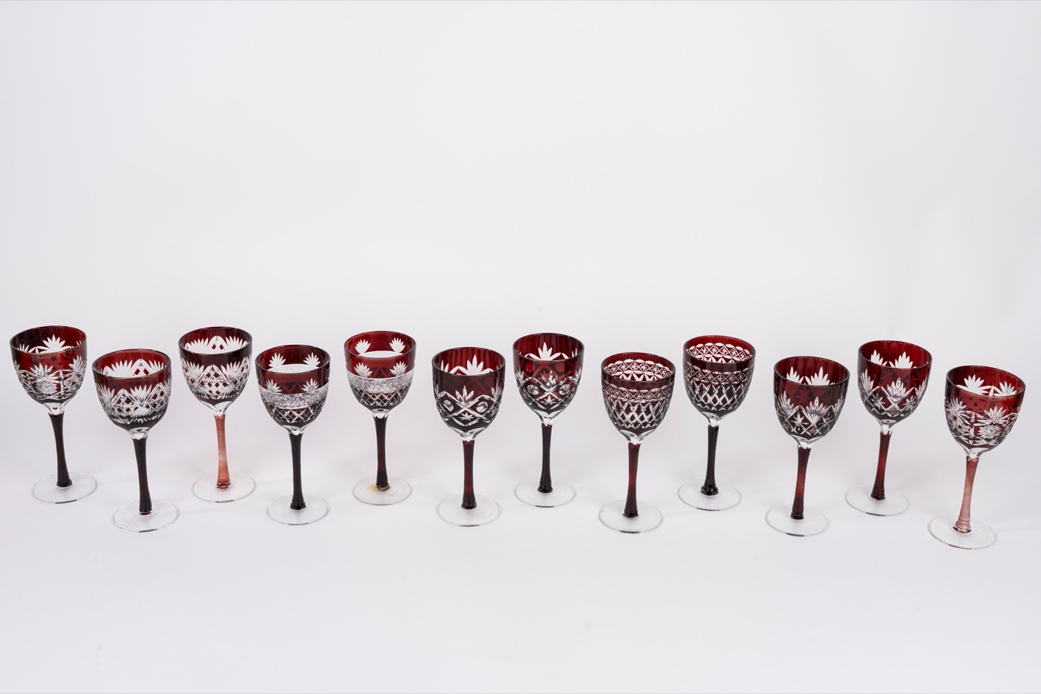 Servizio da dodici calici in cristallo di Boemia rosso molato e inciso