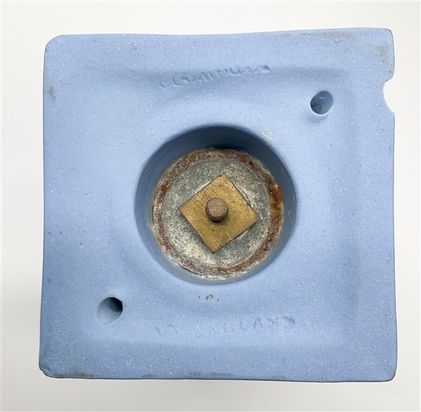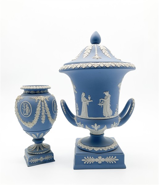 Manifattura di Wedgwood, secolo XX. Lotto composto da una potiche biansata con coperchio e un vasetto in ceramica decorata a figure classiche bianche a rilievo su fondo azzurro. Marcate sotto la base (h max cm 30) (difetti e vasetto mancante di coperchio)