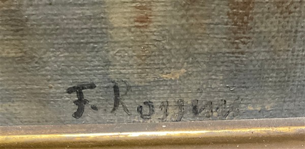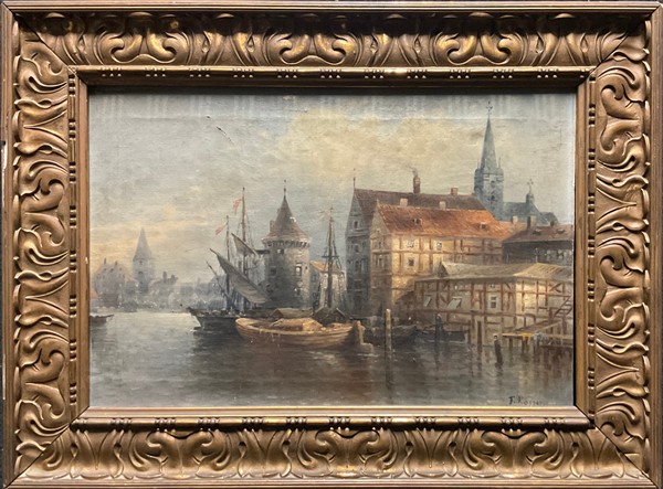 F. Rossini "Scorcio fluviale di città Nord Europa" olio su tela (cm 32x47) fi