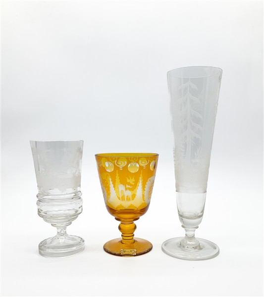 Manifattura di Boemia, secolo XX. Tre calici in vetro incolore e ambrato inciso a paesaggio boschivo con cervi e volute fogliate, uno cifrato L.S. (h max cm 24) (lievi difetti)