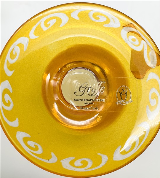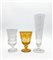 Manifattura di Boemia, secolo XX. Tre calici in vetro incolore e ambrato inciso