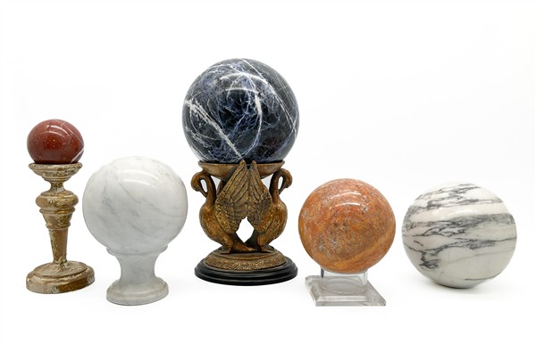 Lot 807 | Lotto composto da cinque diverse sfere in marmi vari di cui una con sostegno a