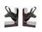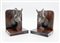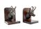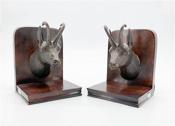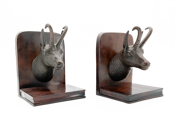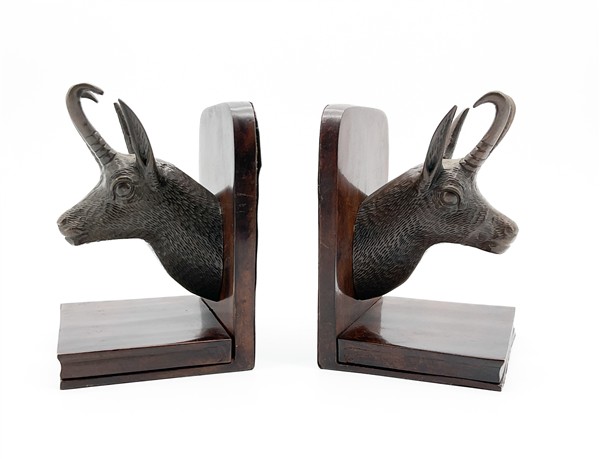 Coppia di fermalibri in fusione di bronzo a forma di teste di camoscio su basi