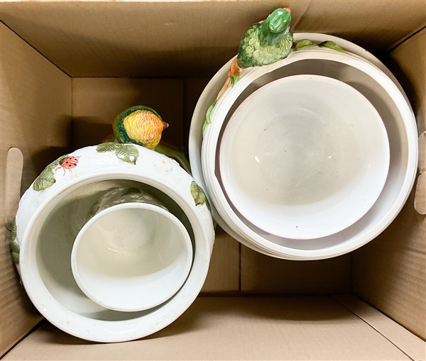 Lotto di numerosi cachepot in ceramica e porcellana di diversa forma e decoro. In un cartone (difetti)