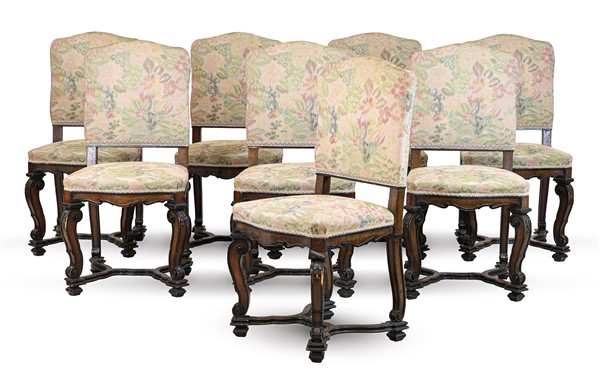 Lot 821 | Gruppo di otto sedie in noce con profili ebanizzati, piedi riuniti da traverse,