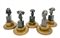 Gruppo di cinque multipli in bronzo raffiguranti musi canini poggianti su plinto in legno (cm tot 17)