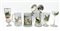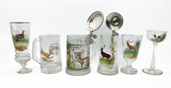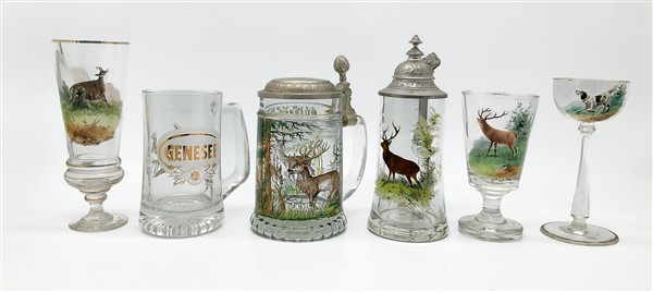 Lotto composto da tre boccali da birra di cui due con coperchi e tre bicchieri differenti in vetro, decorati in policromia con paesaggi boschivi e animali (h max cm 20) (lievi difetti)