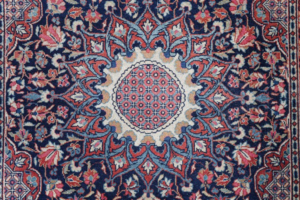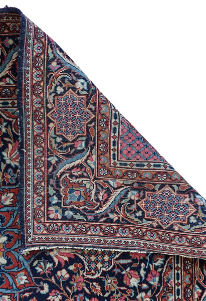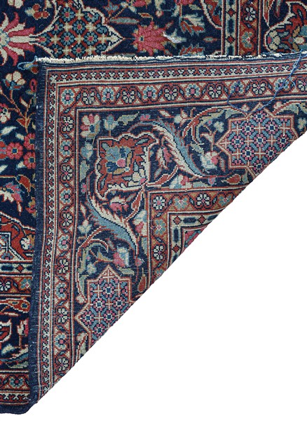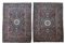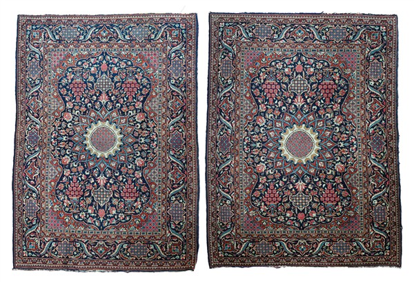 Coppia di tappeti gemelli Keshan Dabir, secolo XX. Decoro con medaglione di tipo Ardebil con puntali su fondo blu notte cosparso di fiori e con quattro vasi fioriti agli angoli (cm max 142x100) (difetti)