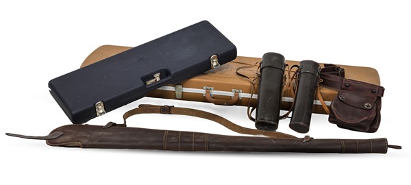 Lotto composto da tre portafucile di cui uno in cuoio marcato Corzo, due contenitori in cuoio e pelle e un porta utensili da caccia in cuoio (l max cm 130) (difetti)