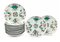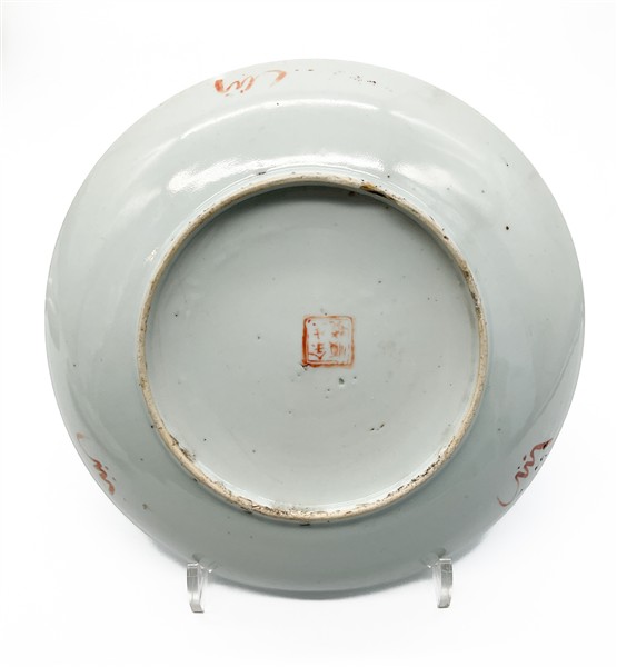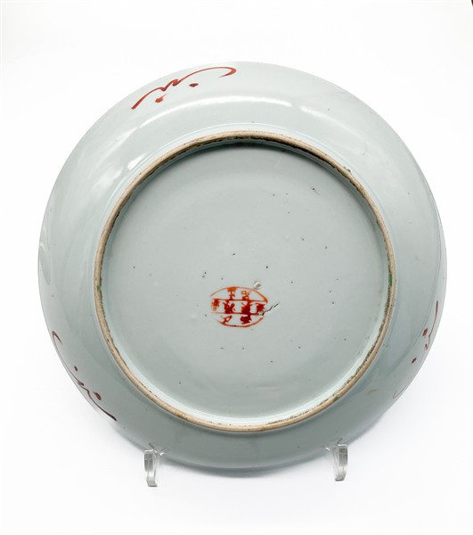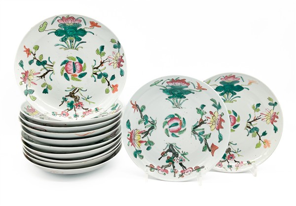 Lotto composto da dodici piatti in porcellana policroma Famiglia Rosa decorati da fiori e simboli benauguranti