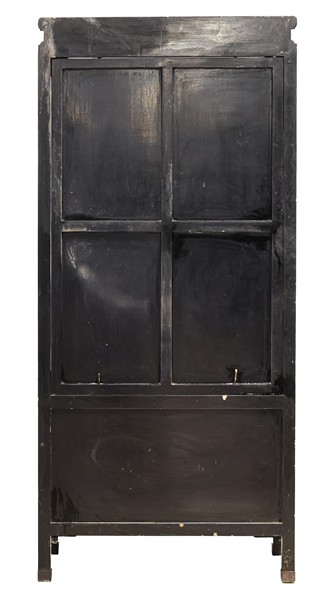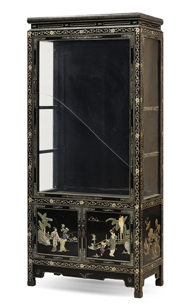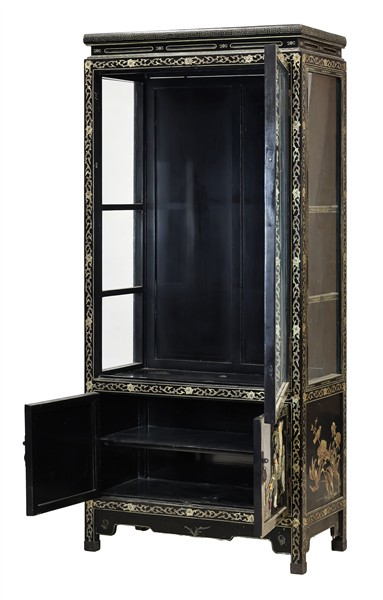 Mobile vetrina ad un'anta e due sportelli in legno laccato e dorato con inserti a rilievo in pietra dura raffiguranti figure orientali e piedi a mensola. Cina, secolo XX (cm 81x176x42) (difetti e rotture)