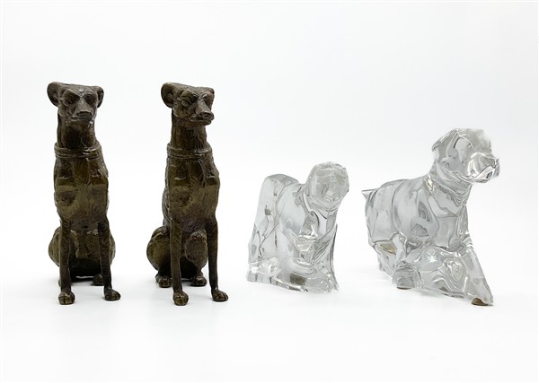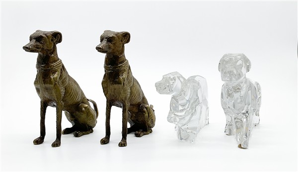 Lotto composto da due sculture in cristallo a forma di cane, firma incisa alla base (l max cm 19) unito a coppia di cani levrieri in bronzo di diversa manifattura (h max cm 14) (difetti)