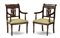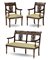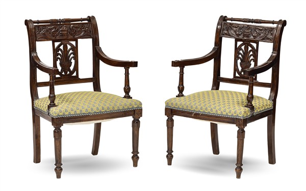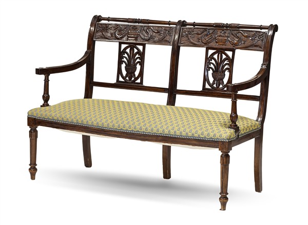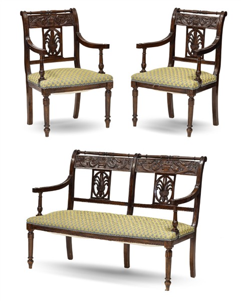 Fornitura da salotto in mogano composta da un divano a due posti (L cm 127) e coppia di poltrone con schienale a giorno traforato a palmetta e fascia con cigni a rilievo, gambe tornite. Secolo XIX (difetti)
