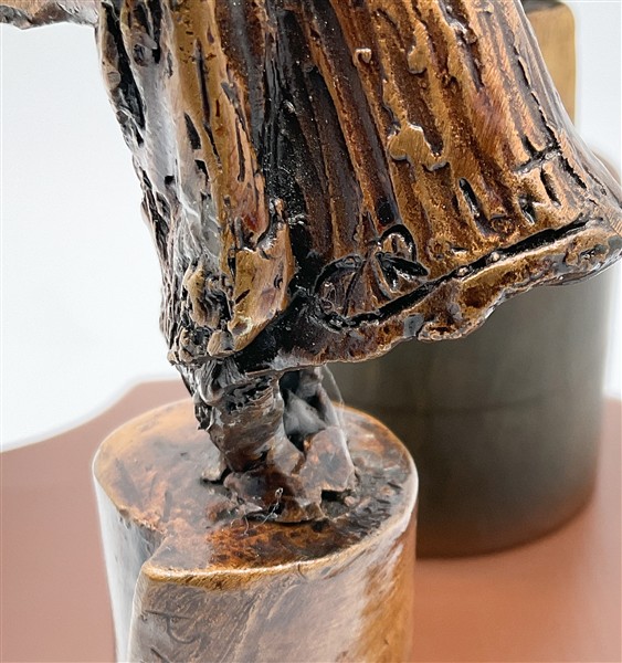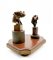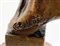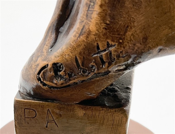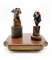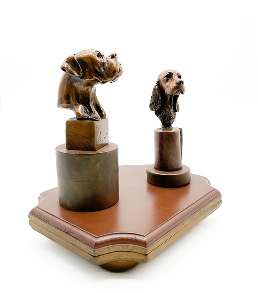 Due sculture raffiguranti musi canini in metallo patinato, poggianti su colonne tornite e pianetto in legno (cm tot 23x22x20) recano firma e iscrizione di prova d'artista (difetti)
