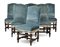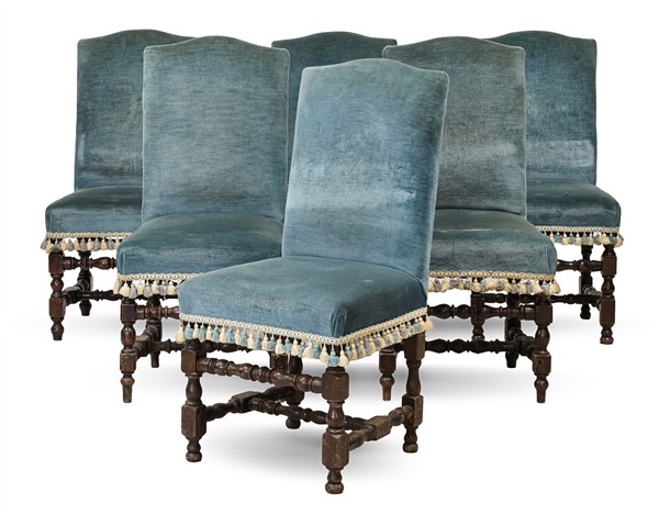 Gruppo di sei sedie in noce tornito a rocchetto di simile decoro. Secolo XVIII. Seduta e schienale rivestiti in velluto borchiato (difetti e restauri)