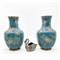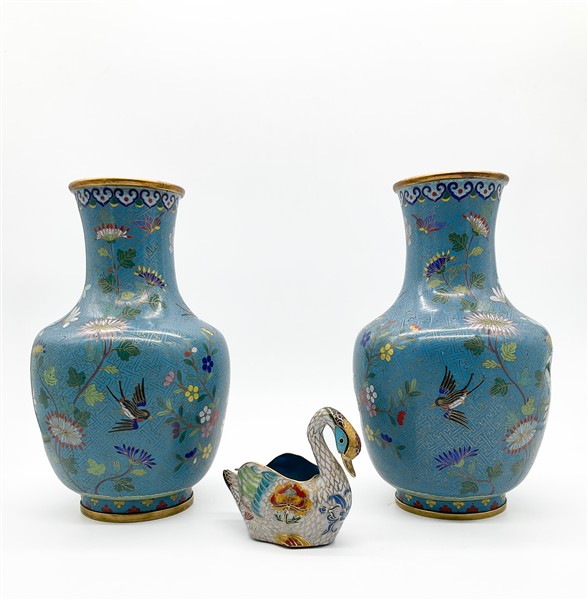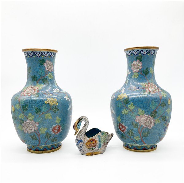 Lotto composto da due vasi in metallo smaltato cloisonnè con decoro floreale su fondo azzurro uniti ad un posacenere in forma di cigno.