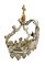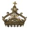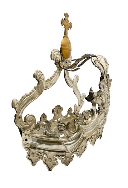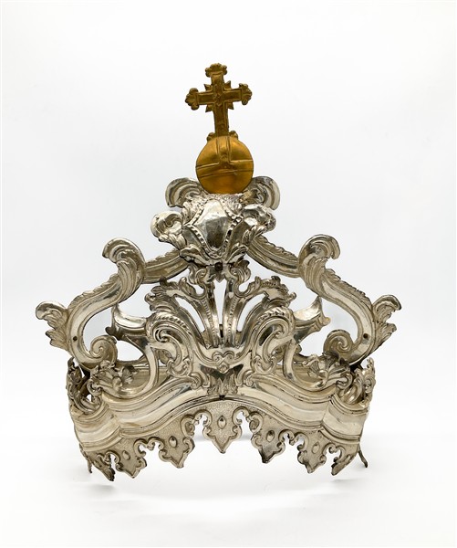 Capocielo da baldacchino ecclesiale in metallo sbalzato e argentato con decoro a volute sormontato da croce su globo. Secolo XIX (cm 49x50x20) (difetti)