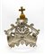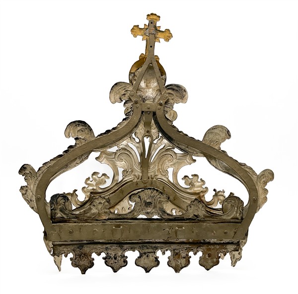 Capocielo da baldacchino ecclesiale in metallo sbalzato e argentato con decoro