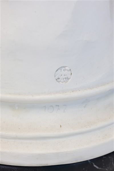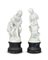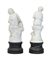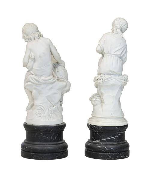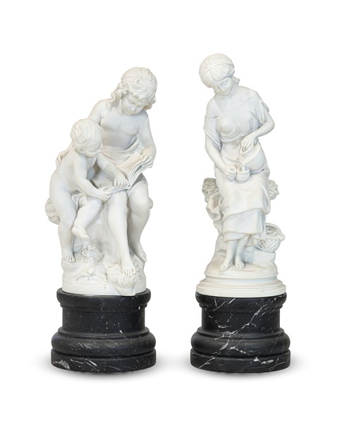 Due gruppi scultorei in marmo ricomposto su base nera striata raffiguranti "La Lettura" da A. Moreau e "fanciulla con brocca". Firma, marchi e numerali impressi (h tot cm 78 e 80) (difetti)