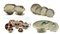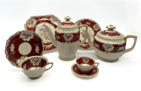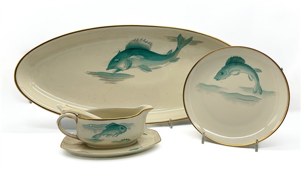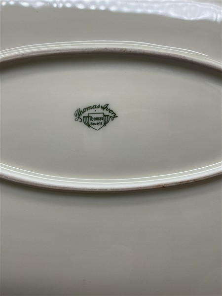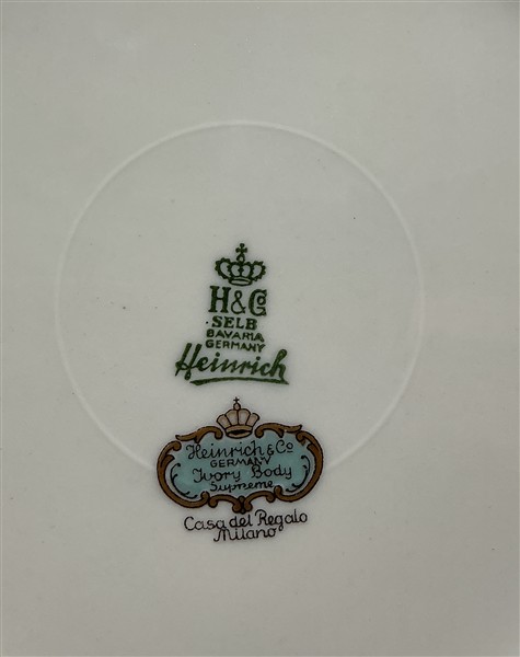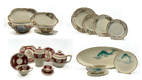 Unito ad un servizio per pesce in porcellana marcato Thomas, composto da dodici piatti piani, un piatto da portata ed una salsiera con mestolo; ed un servizio da tè e caffè in porcellana marcato Heinrich composto da due serie di piattini da dolce, undici tazze da tè con piattini, nove tazzine da caffè con piattini, teiera, caffettiera, due zuccheriere e due lattiere (difetti)