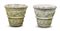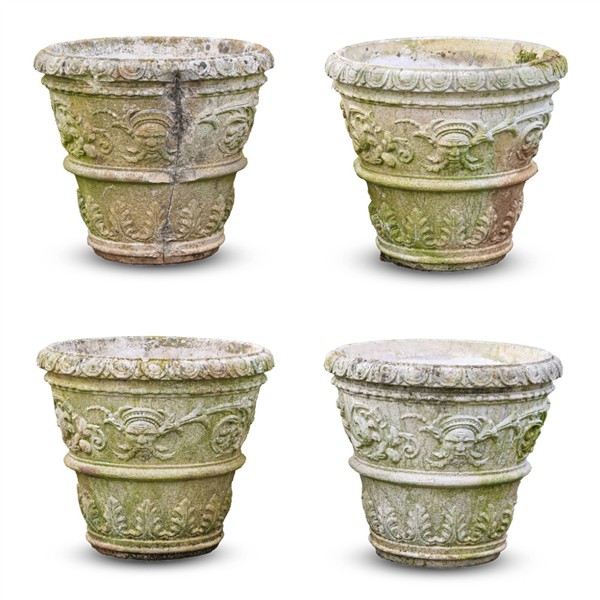 Gruppo di quattro vasi da giardino in cemento con decorazioni a rilievo a giral