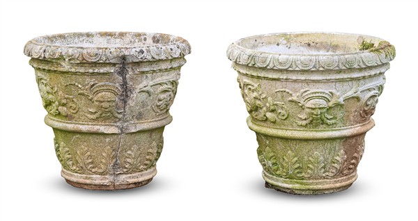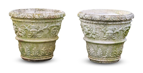 Gruppo di quattro vasi da giardino in cemento con decorazioni a rilievo a girali fiorite, mascheroni e foglie (h cm 50; d cm 55) (difetti)