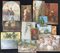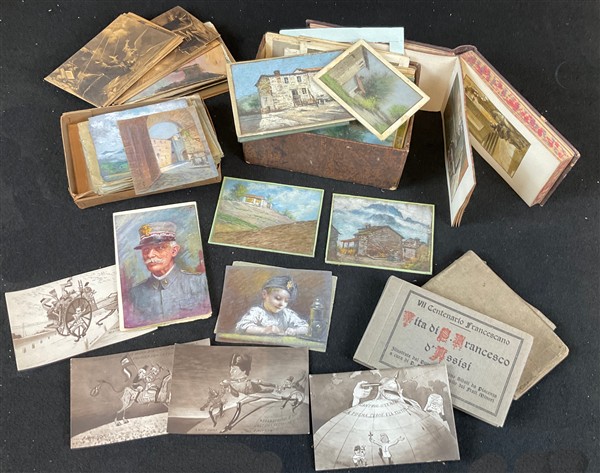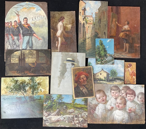 Scatolone proveniente da studio di artista contenente materiale eterogeneo tra cui dipinti, bozzetti e tecniche miste, disegni e riproduzioni (difetti)