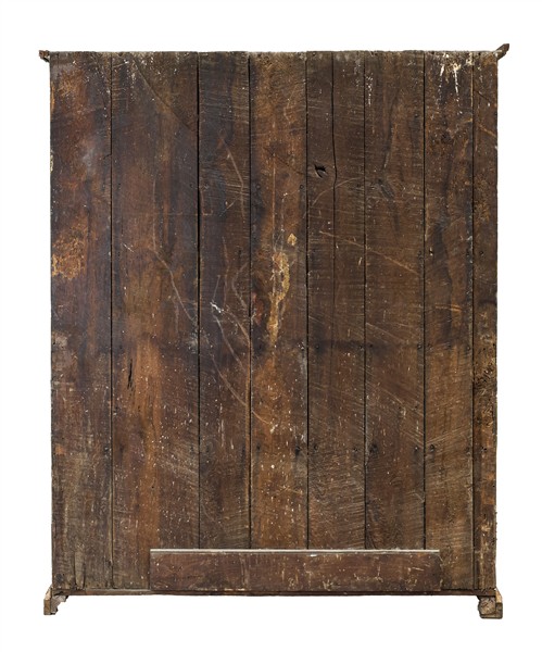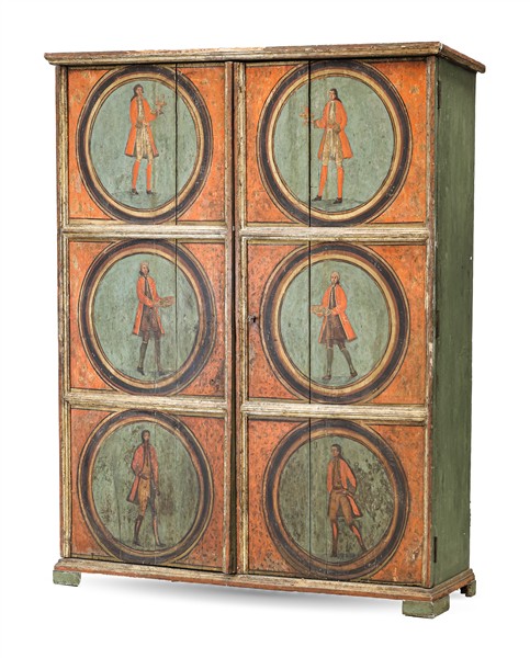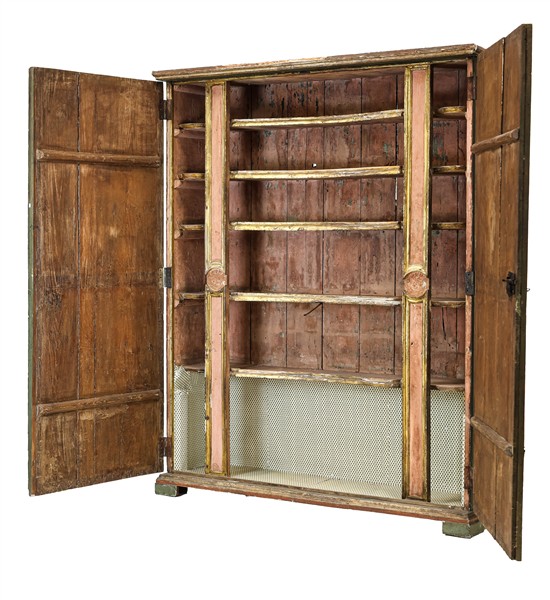 Armadio a due ante in legno dipinto e dorato a mecca, fronte con pannellature decorate con figure di servitori entro riserva circolare, interno con ripiani sagomati. Secolo XVIII (cm 165x202x43) (difetti e restauri)