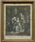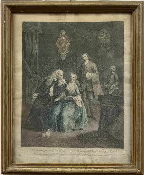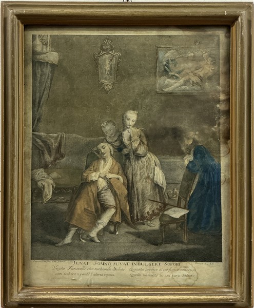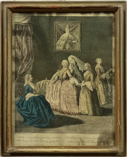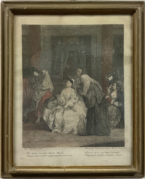 Da Pietro Longhi, autori vari, secolo XVIII. Gruppo di cinque incisioni all'acquaforte su carta con scene di interno parzialmente acquerellate in policromia (cm max al visibile 50x39) in cornici laccate (difetti)