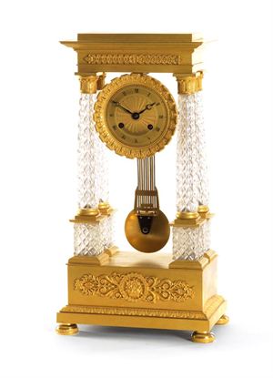 PENDOLA Pendola a 4 colonne in bronzo e cristallo, Francia epoca Carlo X H 38 cm Cassa in bronzo dorato con colonne in cristallo, quadrante in bronzo dorato con numerazione romana, movimento parigino con suoneria delle ore e delle mezze su campanello, sospensione a filo, pendolo a compensazione. Completa di chiave A fine French Charles X cristal and bronze portico clock
