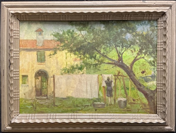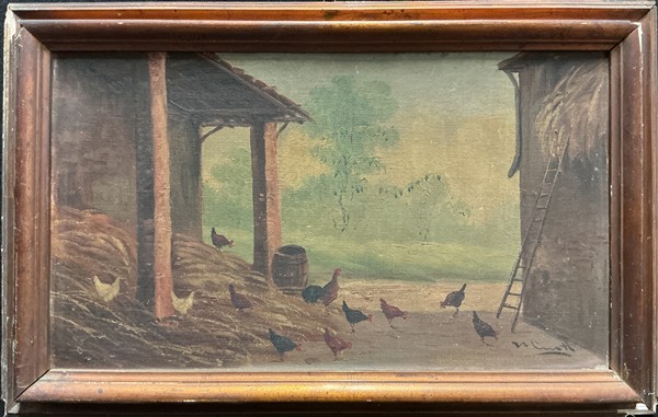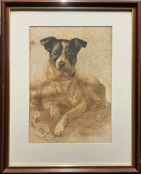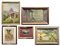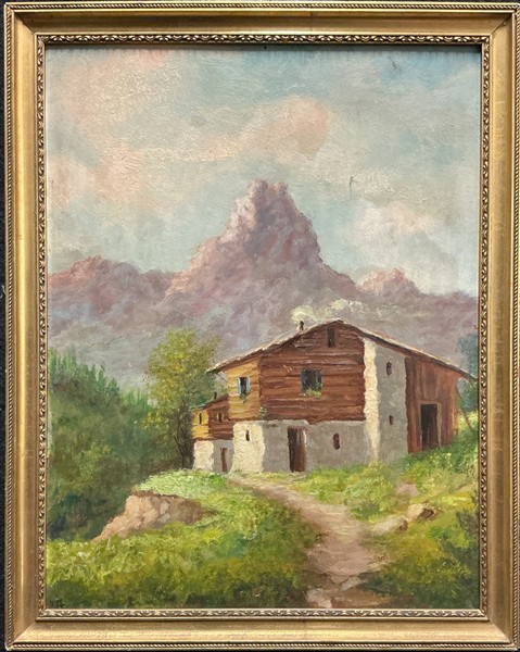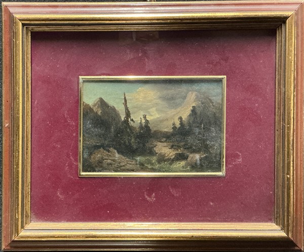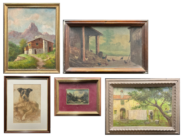 Lotto composto da quattro diversi dipinti raffiguranti paesaggi su supporti differenti, ed una tecnica mista su carta raffigurante un cane (cm max 43x30) monogrammato e datato 1887 (difetti)