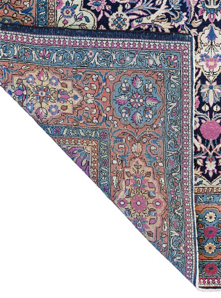 Tappeto Keshan, Persia, secolo XX. Decoro con medaglione polilobato con puntali da cui si diramano girali e rami fioriti su fondo blu notte. Bordura a cartigli su fondo arancione chiaro (cm 216x131) (difetti e cadute di colore)