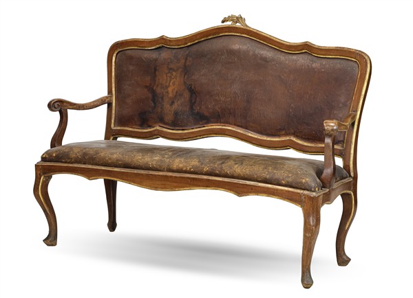 Divano a due posti in noce con bordure dorate, schienale sagomato, braccioli terminanti a ricciolo e gambe mosse, sedute e schienale rivesti in pelle. Toscana, secolo XVIII (cm 152x110x51) (difetti)
