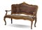 Divano a due posti in noce con bordure dorate, schienale sagomato, braccioli te