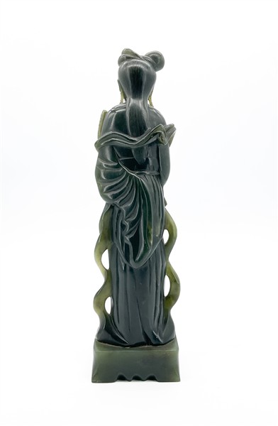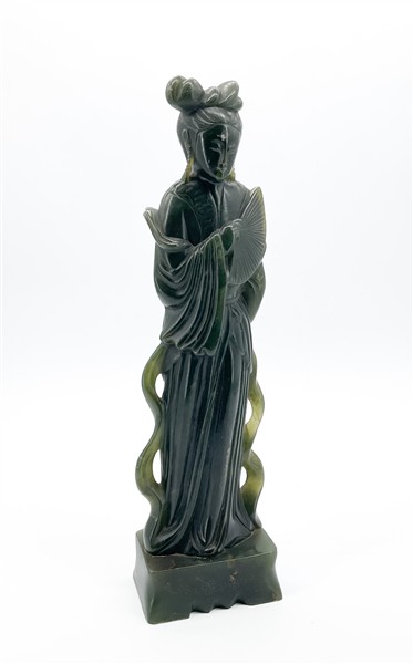 Scultura in giadeite raffigurante dama dalle lunghe vesti con ventaglio nella m