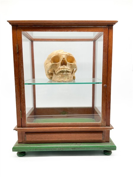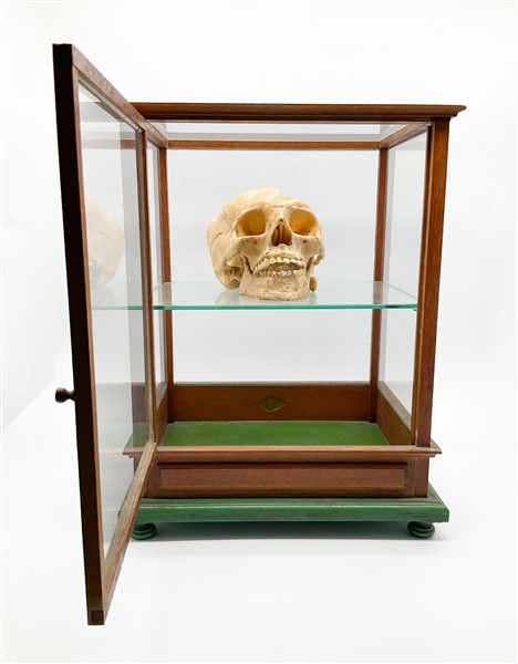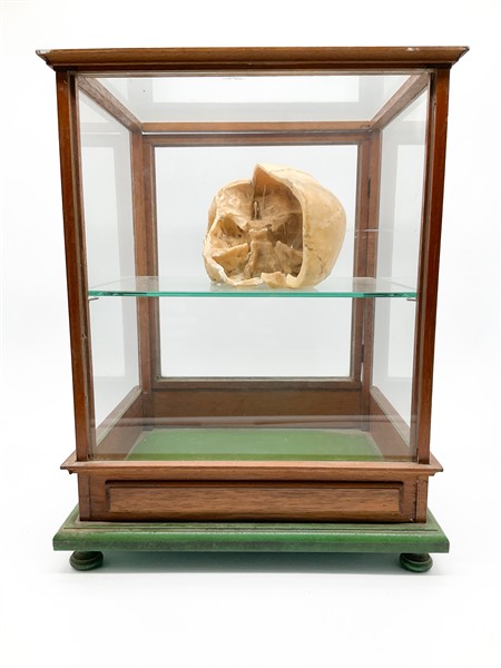 Modello anatomico di teschio in cera entro teca ad uno sportello in legno e ripiano in vetro (cm 36x46x30,5) (difetti e mancanze)