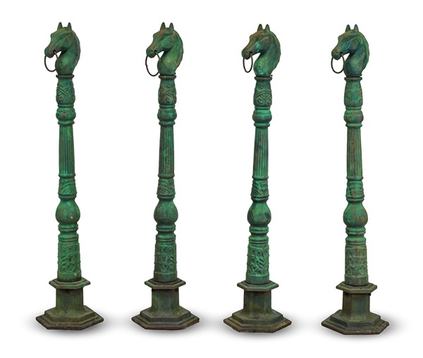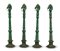 Gruppo di quattro pilastrini in ghisa e ferro verniciati con fusto tornito e scanalato su base esagonale, cimature a testa di cavallo anellata (h cm 133) (difetti)