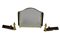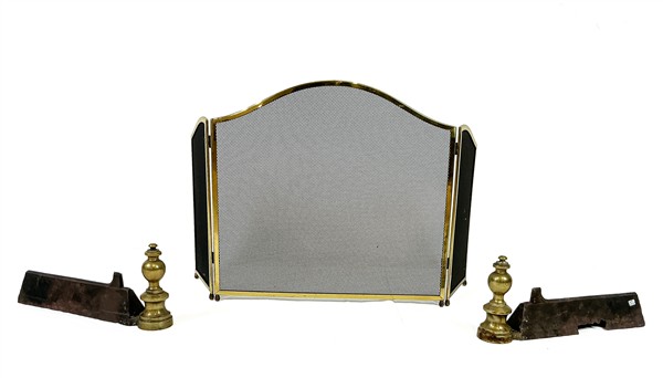 Set da camino in ferro e ottone composto da coppia di alari (l cm 36) e parascintille tripartito (h cm 46) (difetti)