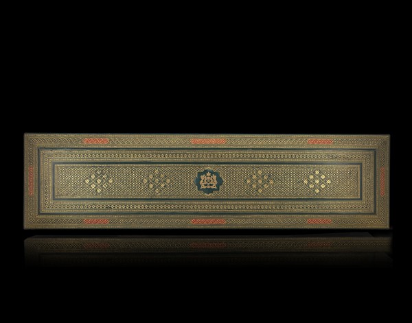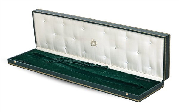 Custodia di legno rivestita in pelle verde lavorata al piccolo ferro con dorature e stemmi della Casa Reale del Marocco. 1980 circa (cm 113x11x30) (difetti)