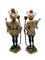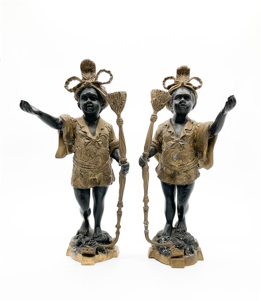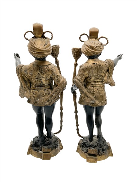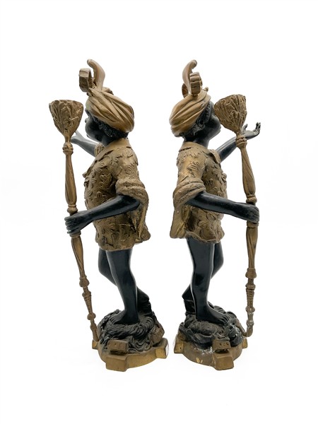 Coppia di figure di moretti in metallo brunito e dorato reggenti portacandela (h cm 38) (difetti)