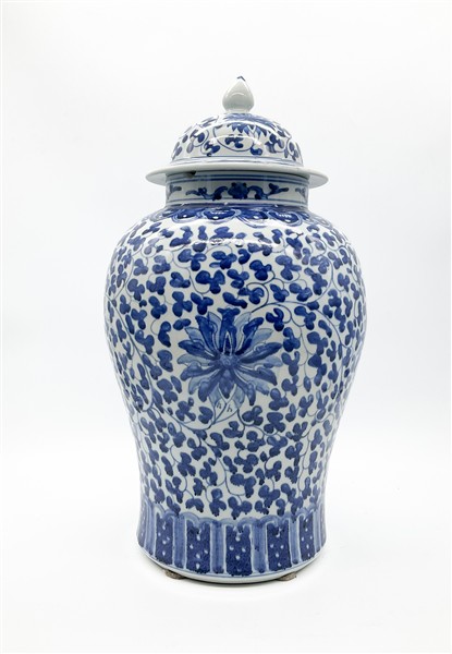 Potiche con coperchio in porcellana dipinta nei toni del bianco e del blu a motivi vegetali