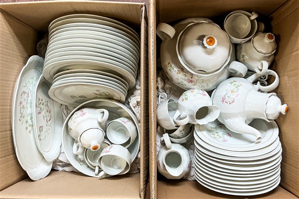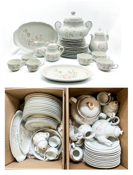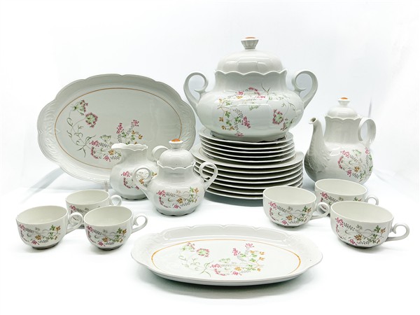 Manifattura Waldenberg, Germania, secolo XX. Parte di servizio in porcellana dipinto in policromia con decoro floreale composto da dodici piatti piani, dodici piatti fondi, cinque piattini, zuppiera biansata con coperchio, insalatiera, piatto da portata, vassoietto ovale, teiera con coperchio, due zuccheriere biansate con coperchio, due lattiere, otto tazze da tè e otto tazze da caffè (difetti e sbeccature)
