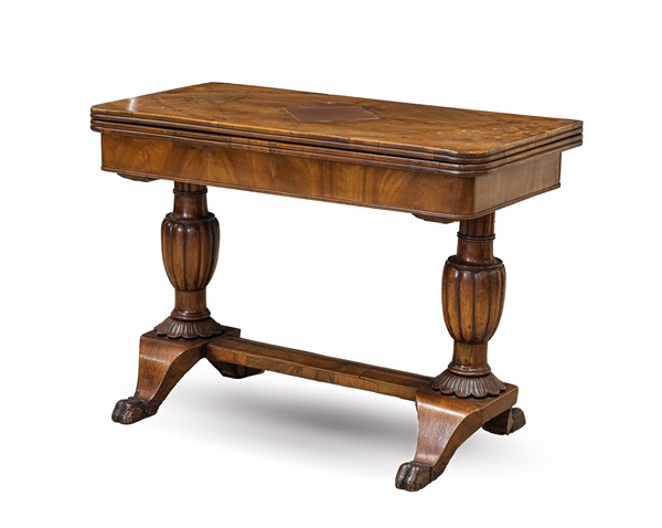 Tavolo da gioco con piano apribile in noce e radica di noce, gambe bugnate poggiante su traversa dritta con piedi ferini. Secolo XIX (cm 96x70x98) (difetti e restauri)