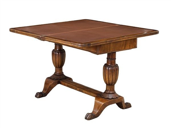 Tavolo da gioco con piano apribile in noce e radica di noce, gambe bugnate pogg