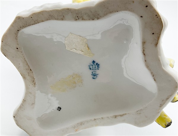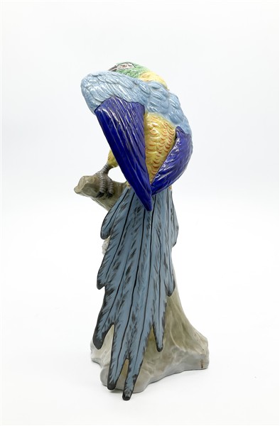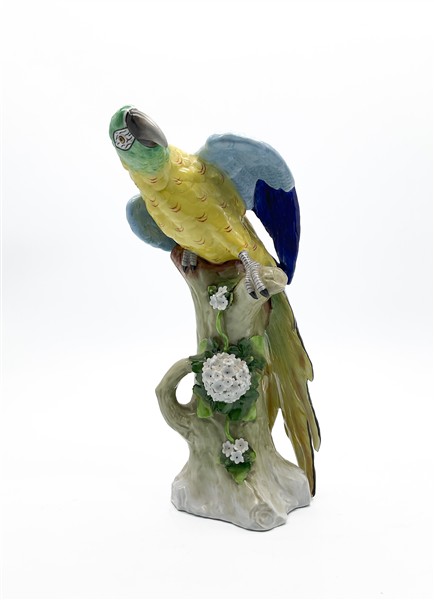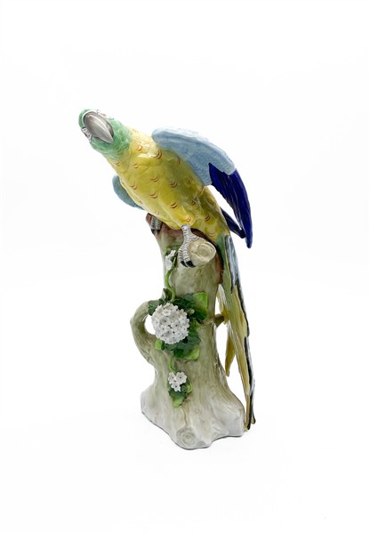 Manifattura Sitzendorf, Germania, secolo XX. Figura di pappagallo su tronco e