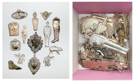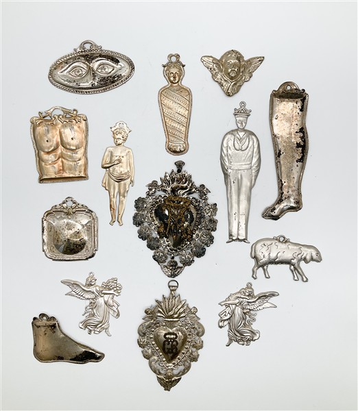 Gruppo di numerosi ex voto in metallo argentato "Per Grazia Ricevuta" di divers